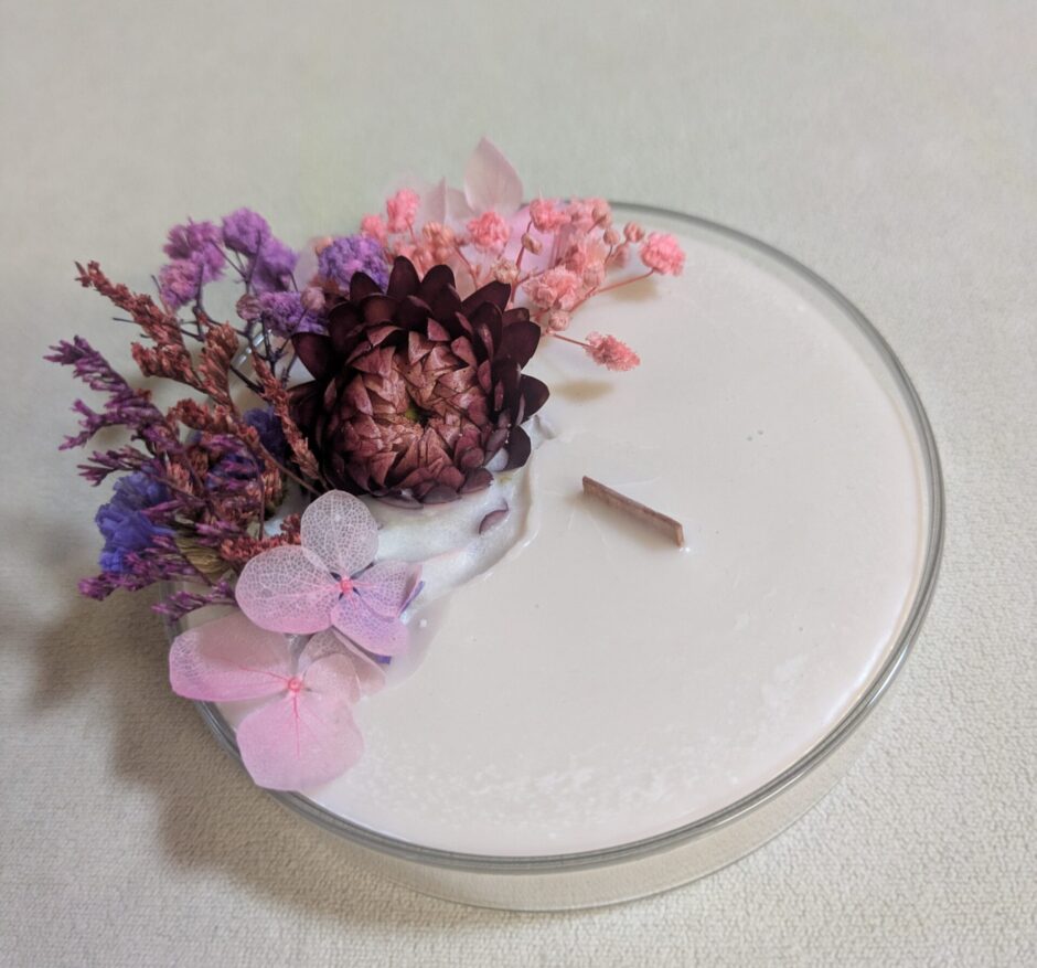ドライフラワーを飾り付けるタイミングが少し遅れてしまい、真ん中にヒビが入り少し不格好になってしまいましたが全体的にはとても満足のいく仕上がりになりました。